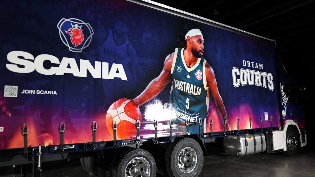 Scania’s Dunk Truck is a P-series rigid fitted out with a basketball ring and accompanying 10-square-metre Dream Courts’ flooring